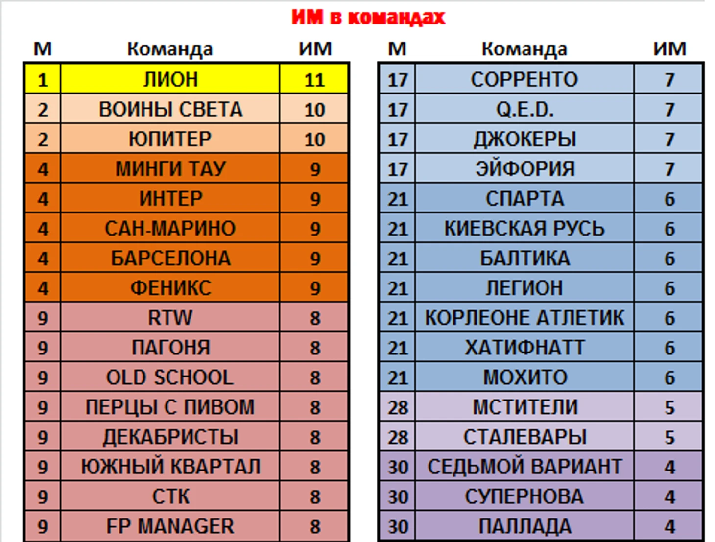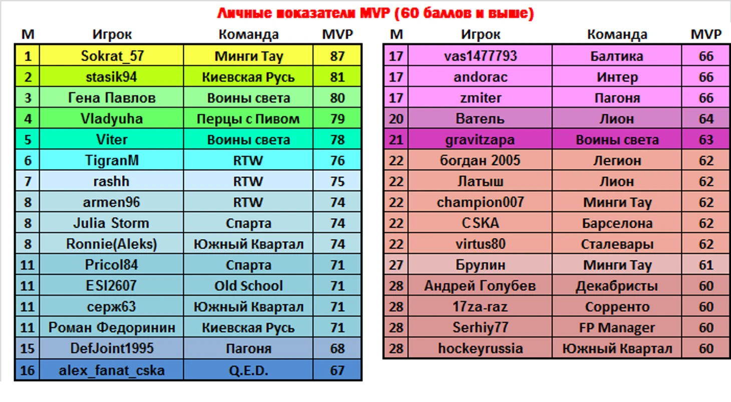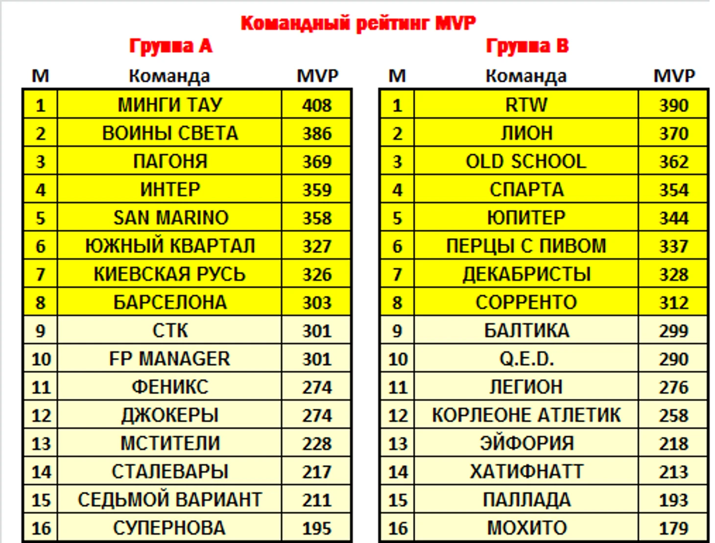 Начинаем с сумм баллов MVP, которые формируются сложением показателей всех игроков команды, куда в том числе включается и исход команды в туре.