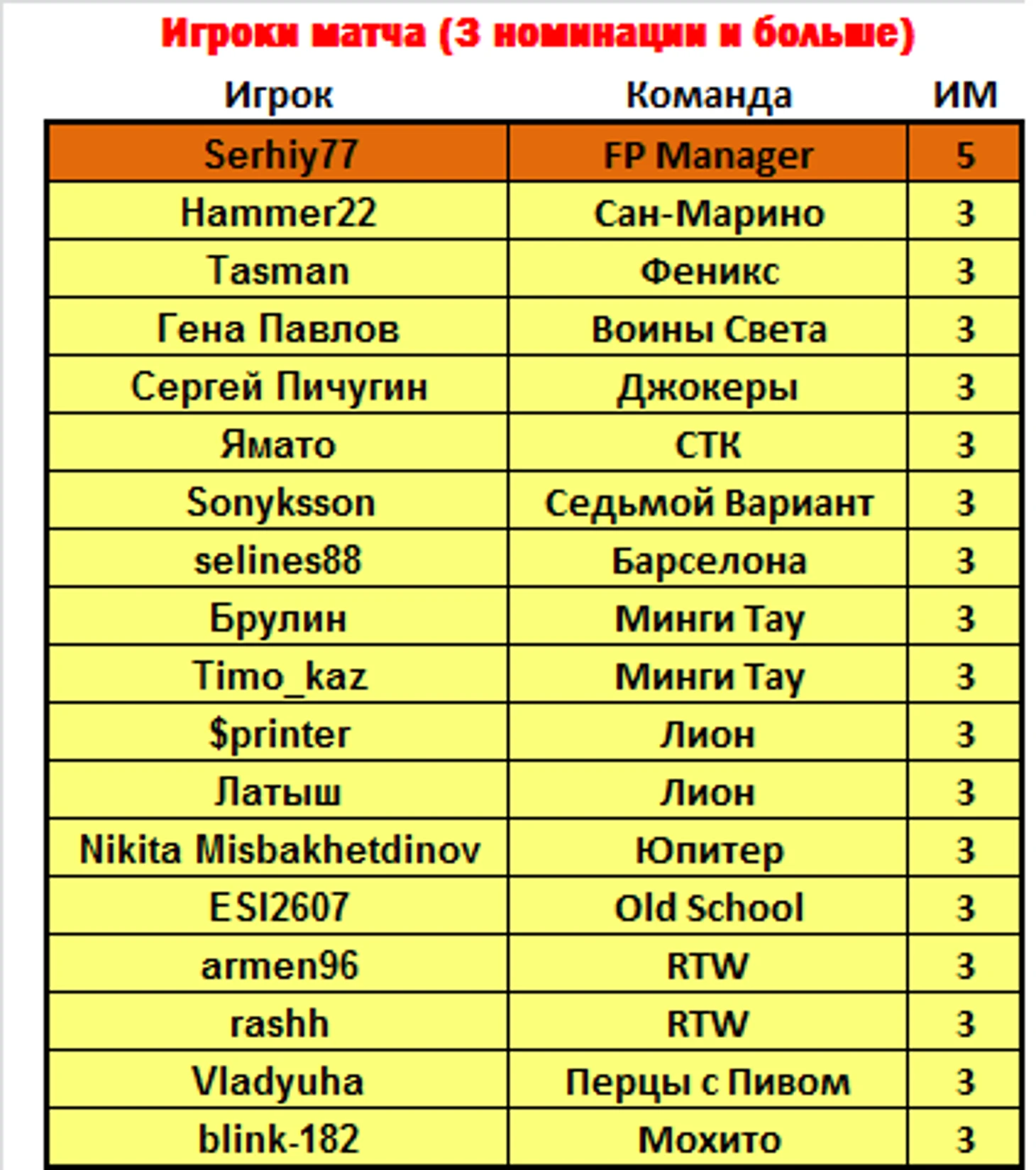 Плавно переходим к личным достижениям, следующая таблица показывает, сколько раз представители какого-либо коллектива признавались игроками матча. Напомню, что отнюдь не всегда ими становятся члены победившей стороны, чёткой корреляции их нет.