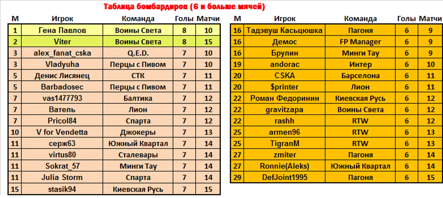Один из наиболее ожидаемых рейтингов, лучшие в гонке бомбардиров. Единоличного лидера по итогам 15 туров нет, однако, тренер Воинов Света Гена Павлов отделён цветом от своего партнёра по команде Viter'a за счёт того, что для 8 голов ему потребовалось 10 раз выходить на поле, а Viter'y - все матчи этапа.