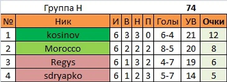 На моё субъективное мнение, это самая именитая и самая сильная по именам группа. Теперь kosinov и Morocco могут гордиться тем, что вышли из такой группы, а Regys и sdryapko свой «невыход» могут оправдать сложностью группы). Чемпион прошлого сезона вместе с Эйфорией kosinov стал одним из двух игроков, ни разу не потерпевших поражение. Он набрал 12 очков и уверенно идёт к заветной цели, но с каждой стадией преграды увеличиваются; сумеет ли он пройти в ¼?! Продолжение следует...))))