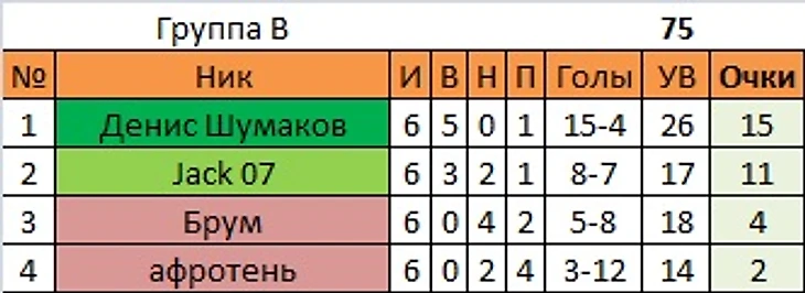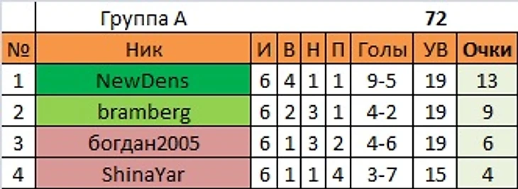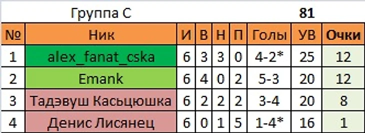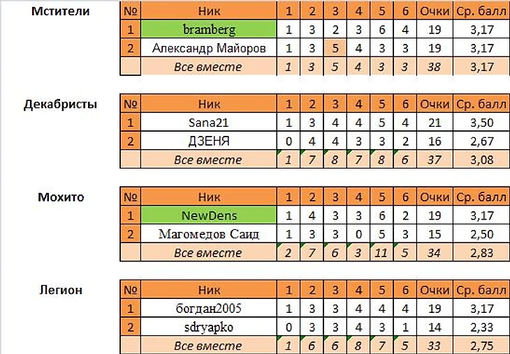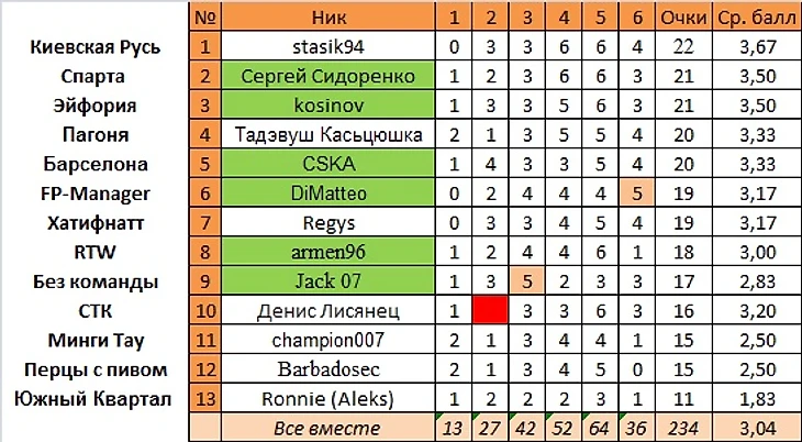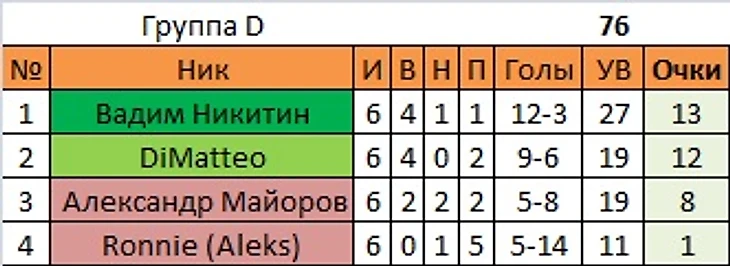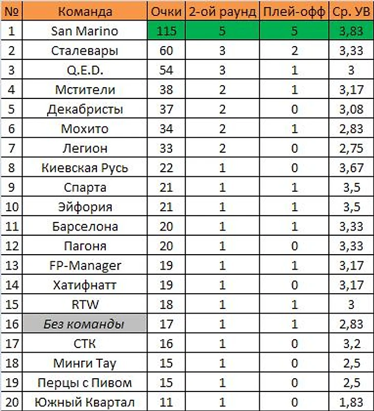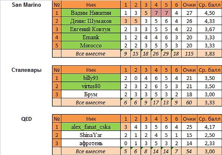 Увидев ткой разброс зелёного-проходного и белого-вылетающего, вы можете предположить, что я забыл отсортировать игроков по сумме УВ. Но нет, оказалось, что в группе одиночных представителей команд всё настолько несправедливо. Вольный Jack07 и главный тренер RTW armen96 оказались очень везучими типами и сумели пройти даже с таким относительно небольшим суммарным баллом. В остальном лишь добавлю, что не ожидал такого слабого выступления от Ronnie (Aleks)'a и Дениса Лисянца и был почти что уверен в их проходе в плей-офф. Но как-то не сложилось...