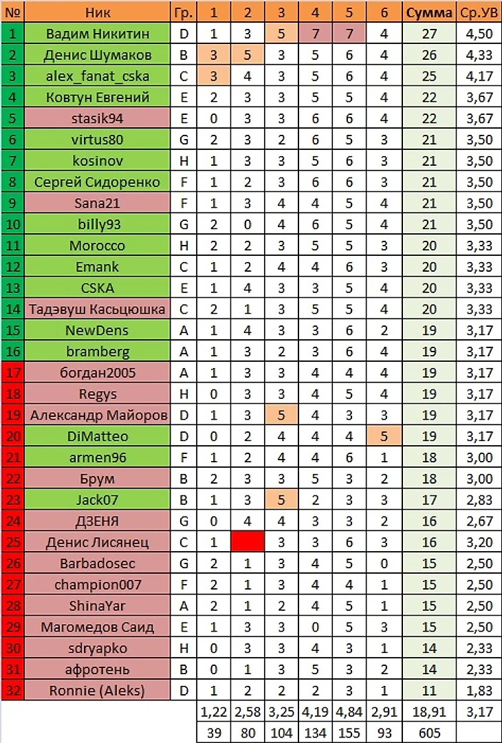 Также хорошему баллу поспособствовало невероятное выступление целой тройки игроков, значительно оторвавшейся от прочих участников групп. Вадим Никитин, Денис Шумаков и alex_fanat_cska сыграли на голову выше своих оппонентов и без особых проблем вышли в плей-офф