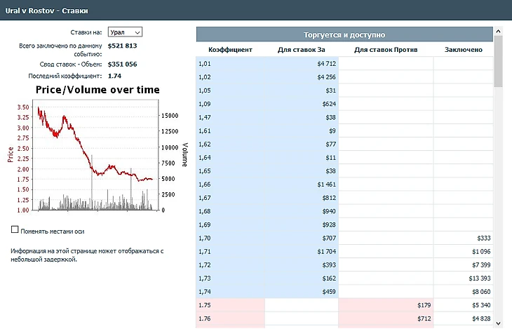 Стоит отметить, что за несколько минут до начала самого матча, на бирже Betfair был зафиксирован очень большой объем ставок на эту игру. На тот момент на рынок исхода матча было принято более 521 тысячи долларов. 351 тысяча из них была поставлена на победу "Урала" и скрин ниже тому подтверждение: