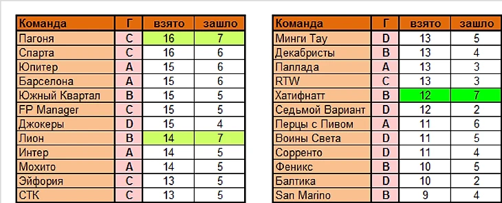 Заход «5» подкосил многих участников тура, никто этот вариант в прогноз не включал, самым популярным пунктом был «6», встречались и «4-ки». Однако, смею предположить, что CSKA из Барселоны допускал сложившийся сюжет, он использовал комбинацию 2-6-9 и не брал «11». Его партнёр MrGrigg182, тоже ставивший «2»,  заряжал в целом на нулевой 1-ый тайм; Ватель из Лиона взял 2-6-8, правда без «11», и, видимо, также склонялся к  повышению активности после перерыва. Хотя присутствие «39» намекает на некую реакцию на события 1-ой половины, и как раз замена произошла, Фейеноорду нужно было форсировать игру. В итоге Ватель при потере 6-8 накрыл всё остальное (2-14-29-34-39). 5 УВ выбил он, CSKA и vovan_t из Мохито. CSKA к сценарной комбинации 2-9-14-29 добавил "38", а вот с карточками ошибся, ждал "35"; vovan_t обошёлся без генерального исхода, сработали 9-14-29-34-39. Возможно, кто-то подумает, не совершил ли опечатку, написав "38", но это не так: в МДП сыграли 2 варианта заменной секции и оба они активно использовались. "39" чаще, конечно, фиксировался, но и "38" рассматривали 9 команд. Балтика, например, загрузила на него 4 линиями, а у Сан-Марино и Хатифнатта произошёл масштабный размен "38-ых", по два открытых. "Хатти" при этом и про "39" не забыли, а задействовать оба варианта отважились совсем немногие: Лион, Минги Тау, Перцы с Пивом, отчасти Южный Квартал (у "южан" оба были единичными). Тренер Перцев Dyadya Vitya рискнул включить оба в один прогноз, и этот манёвр полностью оправдался.