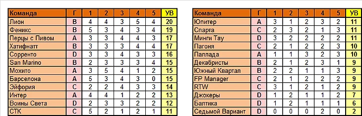 Лучшая команда тура по сумме УВ в целом: Лион (20 вариантов)