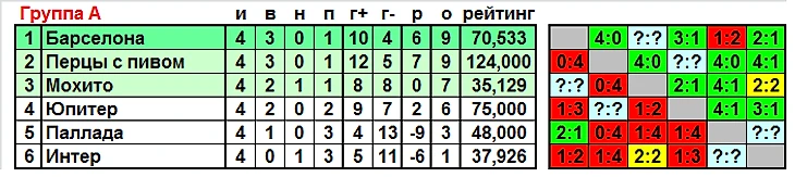 Начинаем с группы А, здесь одна команда уже обеспечила себе место в плей-офф, это Барселона. Однако, стимулы одержать победу в последнем туре неё есть, и это не только желание взять реванш у Мохито за поражение в полуфинале Кубка, но и сохранить 1-ое место в группе, которое позволит миновать стадию 1/8 и спокойно ждать соперника по 1/4. При занятии 2-го и 3-го мест придётся играть и в воскресенье. Барсу устроит победа с любым счётом, Перцы при таком исходе останутся позади, а также ничья, при условии, что Перцы не обыграют Юпитер. А вот поражение, как ни крути, повлечёт спуск по таблице, ведь Мохито наберёт 10 очков и обойдёт Барселону. При этом шансы Мохито возглавить группу не очень велики, это произойдёт только в том случае, если Перцы уступят Юпитеру. Это, кстати, будет зубодробительный расклад: Мохито с 10 займёт 1-ую строчку, Барселона, Перцы и Юпитер окажутся с равным числом очков, по 9, и в мини-турнире личных встреч расположатся в порядке Барселона-Юпитер-Перцы, и последние останутся за бортом плей-офф. Так что, Dyad'е Vit'e и компании архиважно не проиграть "инопланетянам" в предстоящем туре. Надеяться на помощь Барселоны, конечно, можно, но зачем лишний раз испытывать судьбу... Юпитеру же нужна только победа, при ничьей он останется 4-ым даже при поражении от Мохито. При выигрыше озираться на параллельную игру не стоит, 9 очков гарантируют ему место в топ-3, но только 2-ое или 3-е.