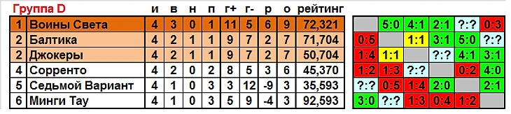 После таких головокружительной плёнки можно немного перевести дух, в группе D кое-что уже ясно до начала 5-го тура. Воины Света абсолютно точно будут играть в плей-офф, но как и Барселоне, полностью расслабляться рано, поражение от Седьмого Варианта с немалой долей вероятности приведёт к потере лидерства, победа хотя бы одного из ближайших преследователей, Балтики или Джокеров опустит Воинов с олимпа. Выигрыш Сорренто (над Джокерами, кстати) при невыигрыше Балтики не поколебит позицию Воинов, личная встреча осталась за батальоном Гены Павлова. Вообще, "светлячки" обыграли всех своих основных конкурентов, поэтому ничья в своём матче тоже оставит Воинов на первой строчке. Остальные же чувствовать себя комфортно не могут. Впрочем, Балтику и Джокеров ничьи устроят, наберут по 8 очков, у Сорренто соответственно, будет только 7. При определённых обстоятельствах и поражение не станет фатальным, особенно в отношении Балтики. Джокеры Но может наступить тонкий момент, что "моряки" проиграют Минги Тау крупнее, чем Джокеры - Сорренто, и останутся вне плей-офф. А может случиться и наоборот, что Балтика уступят скромнее, и тогда пройдут дальше. Джокеры в таком случае выступления в турнире закончат. Сорренто необходима только победа, при ничье и с "шутами" сохранится статус-кво, и Балтику не обойти, даже если та проиграет, личная встреча осталась за "пивоварами".