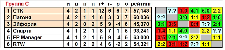 Как видно, она поделена на 3 столбца, в зависимости от исхода матча лидеров на текущий момент. Команды для удобства разбиты по парам последнего тура. Никто из них ещё не гарантировал не то, что первого места, но и места в 1/8 финала. СТК, правда, в более выигрышном положении, нежели Пагоня, у неё лучше разница мячей, и результаты встреч с большинством других конкурентов попредпочтительнее. Но начнём с простого: победа даст СТК железное 1-ое место, Пагоня при таком исходе может спастись в случае невыигрыша Спарты, либо при стечении победы "спартанцев" и ничьей в матче Эйфория - FP Manager. Личная встреча с "эйфами" завершилась в пользу Пагони, и она сохранит место в топ-3. Но сам расклад довольно сложный, необходимо сразу 2 условия. Любопытно, что существует вариант, при котором 2 команды, идущие сейчас в зачётной зоне, в случае поражений из неё выпадут: если Спарта и FP Manager синхронно победят, именно они займут места в 3-ке. Причём Спарта точно будет впереди "менеджеров", гандикап в 5 голов они не ликвидируют. Но ещё выше будут СТК, не забываем. Если же "коноплянки" не одолеют Пагоню, то лидерство они могут и потерять, осечкой может воспользоваться Эйфория. И это единственная команда, которая может обойти СТК при их ничьей. И Спарта, и FP Manager в мини-турнирах с СТК и Пагоней окажутся позади "свидетелей". Пагоню же "менеджеры" пройдут при равенстве очков благодаря победе в очной встрече, со Спартой и те, и другие сыграли вничью, она на их спор не повлияет. Саму Спарту же при ничье между лидерами устроит только ничья и в другом параллельном матче, иначе победитель обойдёт подопечных Сергея Сидоренко. В потенциальном огненном мини-турнире 4 коллективов с 8 очками Спарта окажется 4-ой лишней, с 2 очками она будет наравне с Пагоней, в том числе и по личке, но вот общая разница в локальных разборках хуже. Эти 1:4 от СТК скажутся и в мини-турнирах из трёх команд.И стоит помнить, что участие Спарты в делёжке мест в плей-офф возможно только при собственной победе над RTW, 6 очков (если ничья) будет мало при любых раскладах. Третья ветка сюжетов сходна с первой: если там СТК занимали 1-ую позицию при победе, то здесь на коне Пагоня. И следует обратить внимание, что СТК, в отличии от Пагони, при равенстве очков с Эйфорией вынуждена будет уступить maidenhead'y и Ко cвоё место. Теоретически это может повлечь за собой вылет из топ-3, если Спарта обыграет RTW.