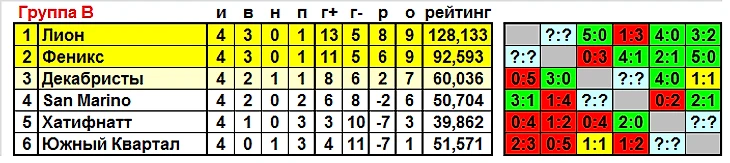 В чём-то похожая диспозиция в группе В, 4 претендента на 3 места, два ключевых матча. В одном из них зарубятся не по-детски Декабристы и San-Marino, в другом - Лион и Феникс оспорят за 1-ое место и прямую путёвку в 1/4 финала. Декабристы при своей победе 1-ую строчку никак не займут, даже если "лионцы" и "птички" победителя в своей дуэли не выявят, то в мини-турнире "реформаторы" окажутся 2-ми, лучшие показатели будут у Лиона, разгромивших их ранее 5:0, плюс одно очко за ничью с Фениксом, которую мы рассматриваем в данном сюжете. Ничья устроит Лион и в отрыве от Декабристов, ведь разница голов у него лучше, чем у Феникса. Команде НЕРОНАЛДО для прорыва вперёд нужно побеждать конкурента. Только победа требуется и San Marino, иначе они не обойдут Декабристов, а Лион с Фениксом улетели далеко. Если же удастся добиться триумфа, то можно зацепить и 2-ое место, если в параллельной битве вверх возьмёт Феникс. Да, Лион при таком раскладе опустится на 3-ю строчку, "республиканцам" он по ходу этапа проиграл. Но сама путёвка в плей-офф не улетит, в этом плане и Лион, и Феникс могут не волноваться.