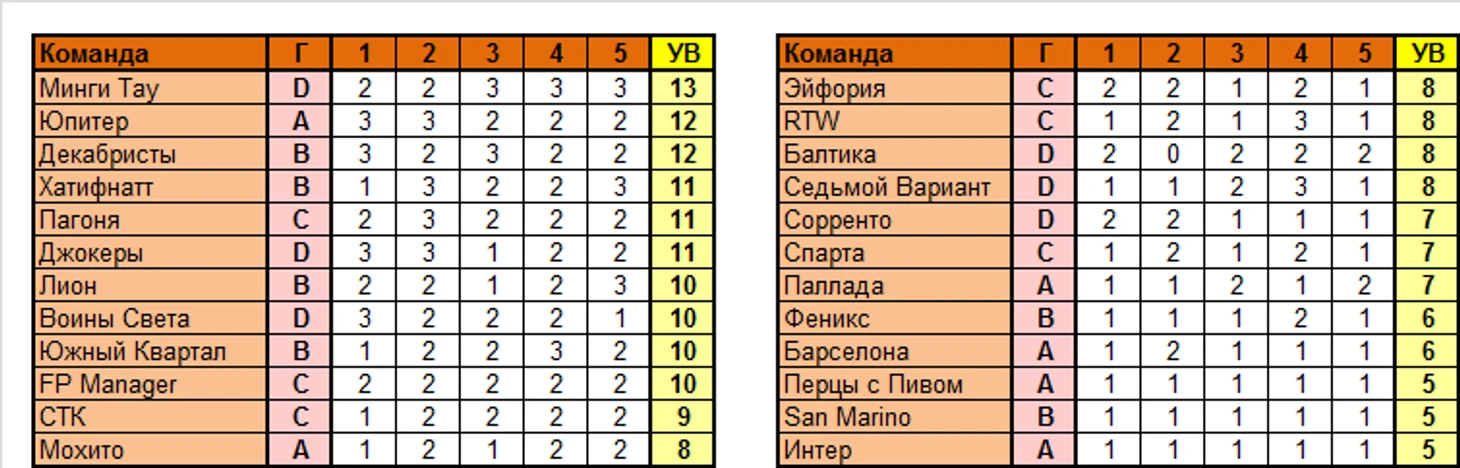 В основном же, от полного провала игроков сберёг "15", "верх" выглядел наиболее вероятным исходом по результативности. Кто верил в Боруссии и уверенно на неё грузил - зацепил "8". Например, именно с помощью 8-15 Мохито переиграло Барселону и благодаря победе Юпитера над Перцами завершило этап на 1-ом месте в группе. В ключевом противостоянии секстета А тоже решающуюю роль сыграла "8-ка", которую по максимуму задействовали "инопланетяне", а "перцы" отбросили вовсе. Ставка на насыщенный второй тайм, выраженная в 11-22, не сыграла. Собственно, из-за её слёта и обилия голов в 1-ом тайме пострадали практически все. "10" захватили всего четверо, но один из них наверняка шальной, ПАНДЮШИК из RTW вряд ли расценивал всерьёз, страховкой с 11 и 17-18. RTW, как и Барселона, решили разгуляться, а для них это вообще был последний матч сезона, и напоследок нужно было чем-то шикануть :) В результате вместе стояли несочетаемые 13-19-20-31, 13-21-30 итп... "21", кстати, ведь зашёл, АРИ угадал с обменом голов, и вообще, развернись он не к 5-7, а к 4-8, быть ему героем тура. А так, главным героем RTW вчера стал TigranM, и угадавший больше всех, и забивший единственный гол в противостоянии со Спартой, которая настраивалась серьёзно, рассчитывая выиграть и выйти из группы в плей-офф. А победили RTW. Похожий расклад случился в группе D, немотивированные Минги Тау разгромили Балтику, которой проигрывать было нежелательно. 3-ки "морякам" не особо помогли, 8-15-23 перебили. Минги стали лучшей командой тура, выбив 13 вариантов. Но и Балтика сохранила позицию в топ-3, Джокеры не позволили Сорренто спутать карты, им заряда на "3" в комплексе с "15" хватило для нужного итога.