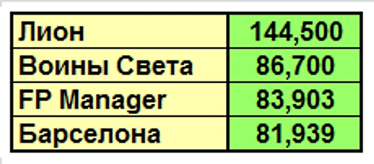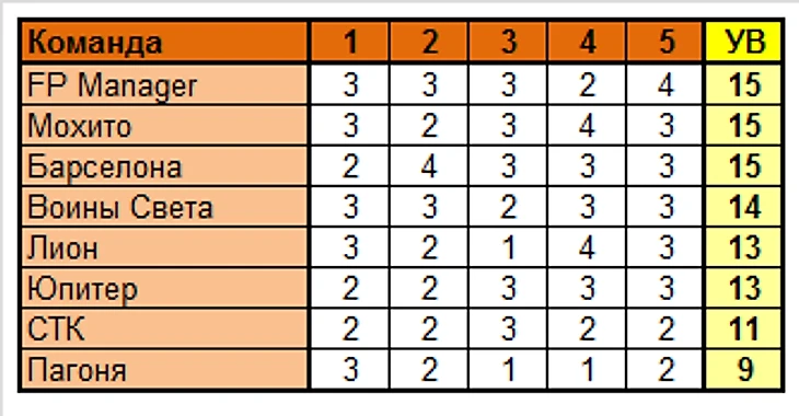 Лучшие команды тура по сумме УВ в целом: FP Manager, Мохито, Барселона (по 15 вариантов)