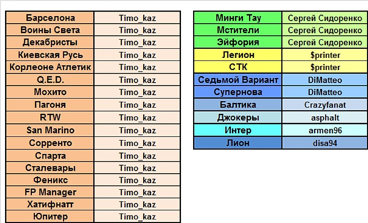 А осенью 2013г. лучшим был избран Сергей Сидоренко. И надо сказать, что тренер Спарты часто попадает в список лучших. Так же, как и Лион, его команда демонстрирует стабильно высокий уровень, провалы единичны и кажутся случайными... Второй сезон подряд Спарта завершает в призёрах, на 3-ем месте. Стоит отметить, что состав команды от сезона к сезону нередко претерпевает серьёзные изменения, и неснижение результатов подчёркивает силу тренерской мысли Сергея. Её поощрили тренеры Мстителей, Эйфории и Минги Тау.