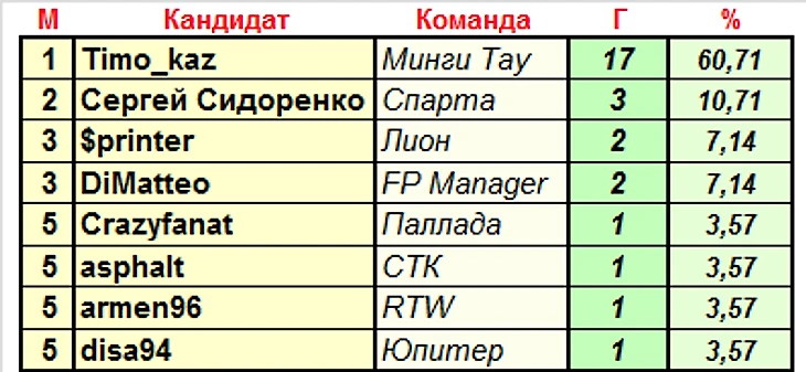 Весной у Тимура есть шанс повторить достижение Владимира Бультинова, стать двукратным обладателем премии два сезона подряд. Либо выиграть её в более отдалённной перспективе, как stasik94. Но лучше, конечно, без длительной паузы :) Впрочем, главное, пожалуй, не статуэтка, хотя почёт среди коллег тоже дорогого стоит, а выигрыш командного трофея с собственным коллективом, что пока Timo_kaz'у не удалось, и чего я ему и желаю в самом ближайшем будущем :)