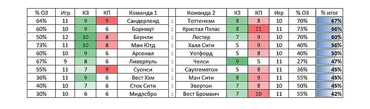 Вот например в случае с самым верхним матчем, я не сказал бы, что Тоттенхэм должен пропустить от Сандерленда, пусть даже и на выезде, потому что Тоттенхэм здорово обороняется. Но цифры говорят сами за себя: в 10 гостевых встречах "шпоры" пропускали 8 раз (80% матчей), и столько же раз забивали, а Сандерленд дома забивал в 9 играх из 10.