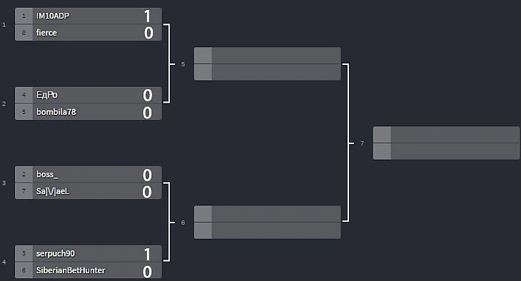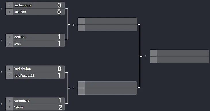 Первый день получился очень интересным, на "Юге" сразу три сенсации, Вархамер не смог добыть победы на Мелфаером что просто не явился на поединок, Yerkebulan неожиданно летит ФордФокусу, а Видар выдал 2 из 2 и повел в серии с Воронцовым 1-2,  а в битве  adil158 - avet  как и ожидалось, ничья!) На Севере Имам подтверждает класс и ведет 1-0 против фьерса, serpuch90 так же повел 1-0 против Сибирского Охотника, а в остальных парах ничья 0-0, с каждым новым днем важность победы становится все выше и выше, на кону выход в полуфиналы конференций!