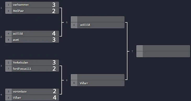 В самой равной паре победил представитель Азейбарджана, правда Адил заканчивал противостоянии, "игра разума" закончилась тем что Авет сдался и первым опубликовал свою ставку, но на тот момент по прибыли было следующая картинка: Адил +265 у.е. - Авет +285 у.е., и вот же было веселье когда Авет дает кэф 2.00 что в случае успеха дает ему прибыль +385 у.е., и сразу же Адил дает ставку с кэфом 2.20, что в случает того же успеха дает ему цифры +385 у.е, по истине невероятно равная серия, правда чудо развязке не суждено было сбыться, Марвин Уильямс перед 4 четвертью имел 8 очков, и кто знает сколько он отыграл, если бы не рывок Нетс. И набрав свои 6 очков за 5 минут до конца Марвин завалил ставку Авету, и тому оставалась только надежда на ТМ в Хьюстоне, но уж больно Хьюстон был в огне, половина получилась очень результативной и тотал был пробит на 7 очков и это подарило Адилу путевку в полуфинал где он ждет итогов битвы Имама и Фьерса, и кто бы ему не попался, легкой серии там точно не будет.