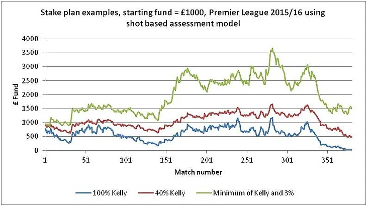 График ниже показывает теоретический банк, при использовании формулы Келли и регулированной формулы Келли, на протяжении сезона Английской Премьер-лиги сезона 15/16, используя статистический шаблон, чтобы определить цену - для того, чтобы изобразить эффект этих стратегий. Этот сезон был необычным, поскольку в первой части было много случаев, когда высокий коэффициент проходил - в таких случаях формула Келли, по сравнению с фиксированными ставками, показывает себя плохо.