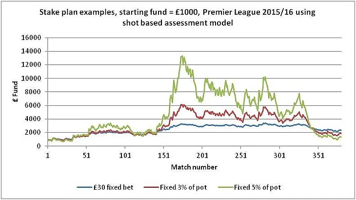 График ниже показывает теоритические колебания нашего баланса за сезон английской Премьер-лиги сезона 2015/16 при использовании основанной на статистики ударов, для того чтобы определить цену, предполагая, что все матчи были сыграны последовательно. Суть в том, чтобы показать потенциальный риск/награду ставочных стратегий, а не окончательное возвращение в конце сезона.