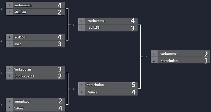 Если оба участника делают одновременно 4-4, победителем признается участник с большей прибылью за раунд плейофф, это же правило действует при любой ничьей после 7 поединков.