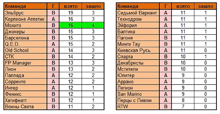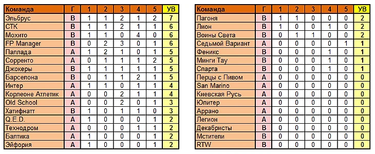 И надо же такому случиться, что они сошлись на одной линии. Мастерс спортс против StivDg, Спарта - Мохито. И в этой схватке безоговорочно преуспел StivDg, поскольку вложился в "орлов" без компромиссов - 1-4-7 и ничего иного. А "спартанец" выложил осторожные 1-6-8, и "1" остался единственным УВ как у него лично, так и у всей команды. Как мы подметили в комментариях с Валерой maidenhead'ом, Геннадий StivDg, грубо говоря, смог бы взять в одиночку не проиграть 13 коллективам: 9 на пятерых вообще ничего поймали, 2 такие команды сошлись между собой, Юпитер и Легион, а 4 отметились лишь 1 скромным огоньком. 121 (!) игрок из 160 ушёл с "баранкой", это, конечно, что-то невообразимое... Помимо исхода, результативности и раскладки по таймам подвели ещё и карточки. Команды особо не буйствовали, не свирепствоввал судья Иррати, и к его свистку в протоколе значились 4 предупреждения. Зашёл "34", а не предполагаемый многими "35". 9 человек всего ожидали "34", 4 из них - представители Паллады, и это помогло им взять очко в игре против Корлеоне Атлетик. "Мафиози" на 2 линиях применили хитрый приём в виде связки 2-5-7, и "7-ка" оказалась отнюдь не лишней. Пригодился и "30" со стороны elnino1892. Разницу в 2 гола подцепил и Andrey Smirnov из Джокеров, но оппонент из FP Manager FiliPpo перебил его комбо из вариантов 12-14-24. Кроме него, ещё двое посчитали нужным поставить "12", Playing the Angel и Johan Nagel. Old School, кстати, находясь на последнем месте, обыграла лидера группы, Киевскую Русь. "Русичи" не попали ни в один зашедший вариант, а у "аксакалов" дали эффект чуйки Johan'a Nagel'я на 12-14 и SergiyRocky на 24. 2:0. А например, Технодром добился подобного успеха благодаря одному "14", его встроили Sexy Boy. Были и команды, которые завершили тур без нулей на линиях, героями стали СТК, Эльбрус и Джокеры. Благодаря такому балансу "шуты" отстояли ничью с "менеджерами", где две линии сработали вхолостую.