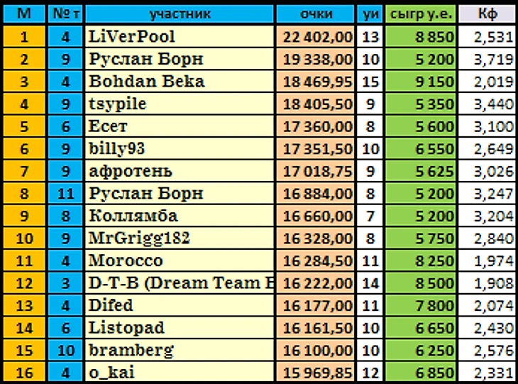 плюс-минус, топ-16 (лучшие по набранные очки минус поставленные у.е.) (при кликании на картинку откроется полный список)