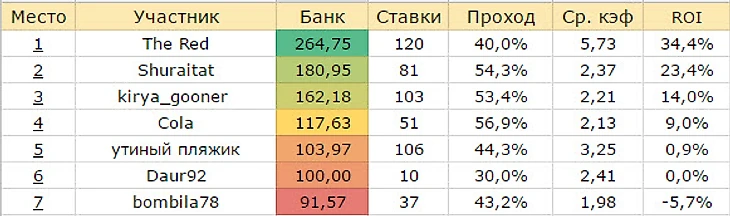 В Высшей лиге продолжает лидировать The Red, более того, его ROI почти достиг 35%. Кэфы под пятерку (и выше) продолжают заходить. Сегодня ночью — ставка на стартующий MLS. Кто в преследователях? Shuraitat и kirya_gooner сражаются за вторую строчку. Если взять их показатели ROI, то они просто великолепные. Правда, последняя ставка у Shuratat на итальянское дерби не зашла. Посмотрим, чем ответит преследователь после вчерашней неудачной ночи в НХЛ. В плюсовой зоне остаются Cola, утиный пляжик и Daur92 — с учетом маржи они бьют линию. Надеемся на возвращение Daur92 в турнир и bombila78, который совсем близко к сотне.