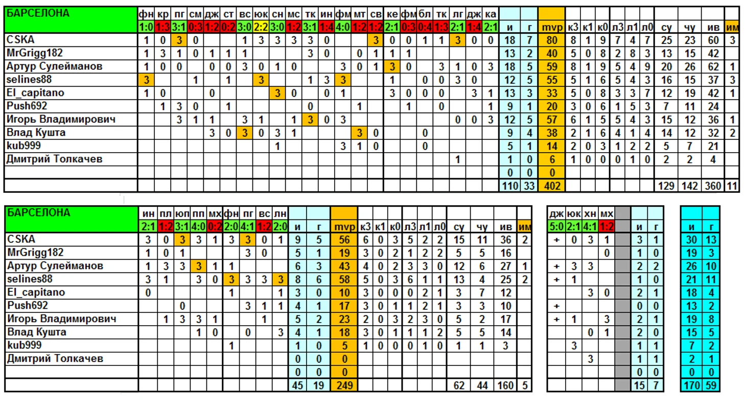 В третий раз подряд Барселона завершала чемпионат в 3-ей подгруппе финального этапа. 4 очков ей не хватило для попадания в зону 5-8, недобрала их в матчах против команд, расположившихся по итогам предварительного этапа ниже её самой, в зоне 13-16: раскладка +1=0-3. А вот с претендентами на высокие места seliness88 со своими подопечными выступали против хорошо, победы над командами 3-5, ничья с 6-ой. У лучших коллективов группы А очки отобрать не удалось. Замечу при этом, что поражение от Минги Тау случилось с минимальной разницей, и вообще, из 8 проигрышей лишь 2 были крупными. По УВ, между прочим, Барселона показала 4-ый результат среди команд группы А. Недоставало Барсе внутреннего баланса на линиях. Seliness88 активно тасовал игроков по ходу первого этапа, на финальном ротация заметно снизилась: незаменимым был CSKA, ставший в итоге лучшим бомбардиром команды в Апертуре; всего по одной игре пропустили Артур Сулейманов и el_capitano; в 5 турах из 7 тренер выпускал себя сам. Любопытно, что если в 7 дуэлях предвариловки seliness88 ни разу не проиграл и из 4 вышел победителем, то в финальной части 3 поражения в 5 матчах.