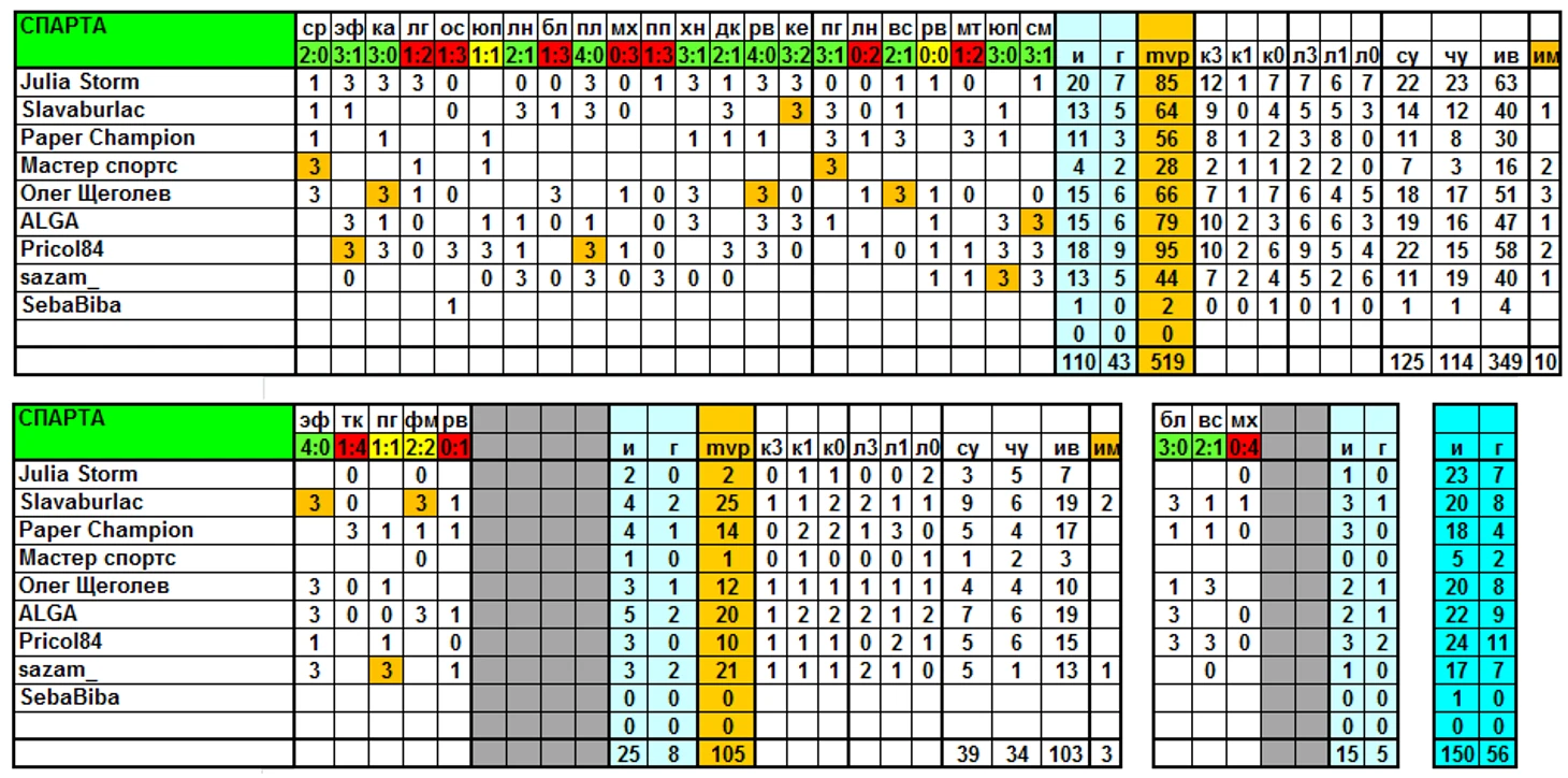 Спарта подтвердила свой статус одной из самых стабильных команд в хорошем смысле данного эпитета. В 6 чемпионатах из 8 "спартанцы" занимали место в топ-6. При этом, как я не раз отмечал в нарезочках и обзорных постах, Сергей Сидоренко часто преобразовывает состав команды в межсезонье и, как правило, приходящие игроки его не подводят. По сравнению с весной произошло некоторое сокращение, часть карьеру приостановила, а FiliPpo принял приглашение DiMatteo и перешёл в FP Manager. Пополнил же коллектив Олег Щёголев, хорошо зарекомендовавший себя в играх за Аррано в летнем квалифае. И для дебютного большого сезона показал весьма достойные результаты, +6=4-5 в Апертуре, +1=1-1 в Суперлиге, +1=1-0 в Кубке. Разделил 3-е место в списке бомбардиров команды за сезон. "Спартанцы" вообще, как подобает спартанцам, выступили ровно и мощно, 6 человек из 9 (а если не считать появившегося лишь раз в основе Sebabib'y, то из 8) забили 7 голов и больше. Меньше только у Мастер Спортса, проведшего всего 5 игр на поле, и Paper Champion'a, но он по-своему внёс весомый вклад в успех команды. Пока его партнёры рубили мечами, он своим щитом сдерживал атаки оппонентов. Лишь 1 раз в 18 (!) матчах он уступил свою линию. Да, всего 4 победы, но, как я не раз подчёркивал, ничья на линии имеет важное значение при командных победах с минимальной разницей в счёте и ничьих, за которые также набираются драгоценные очки. У Спарты такие исходы были, и борьба велась за самые высокие позиции. Да, решающую победу, выведя себя в топ-4, Спарта одержала 3:2 без Paper Champion'a, но были ранее иные сложные игры, где он помогал отстоять результат.