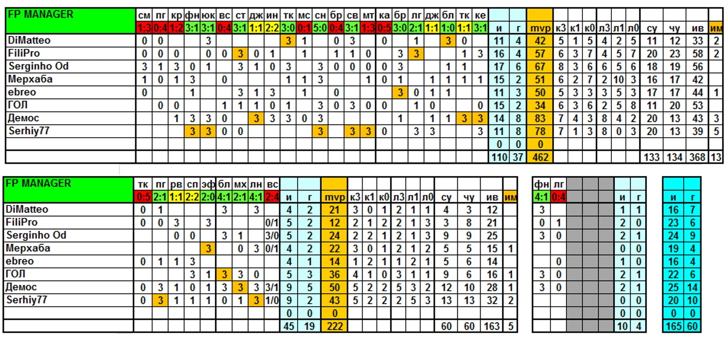 Лучшие бомбардиры: Serhiy77 (8 голов в 11 матчах), Демос (8 голов в 14 матчах)