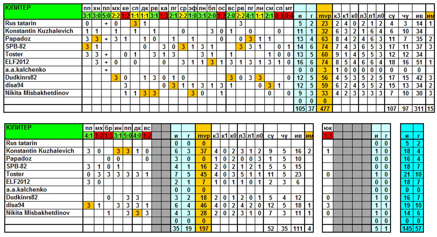 А вот второй матч на вылет сложился не в их пользу, проиграли 1:2 будущим победителям турнира, Воинам Света... А ведь очень здорово действовал disa94 и в тренерском плане, и на поле, забил 4 гола в 6 играх, в 2 сведя дуэли к ничьей. Ещё круче, правда, выступил toster, выдав бомбардирскую 5-матчевую серию. Первый сезон, между прочим, проводил за Юпитер, и так хорошо вписался в коллектив, по чемпионату тоже вполне приличная стата. Отмечу и другого новичка "юпи", на этот раз дебютанта игры в целом, Nikit'y Misbakhetdinov'a. На первом этапе он проиграл всего раз (+3=3-1), трижды признаваясь игроком матча; чуть смазал финальный (+0=0-2), но в СЛ снова давал сильные прогнозы и выигрывал дуэли (+3=1-0). Интересно, почему сейчас он не так часто выходит в основе команды... Занятно ещё, что Юпитер по весне вновь просел на пост-стартовом отрезке, и если осенью удавалось цепляться за ничьи на 4-7, то сейчас на 3-7 были четыре поражения.
