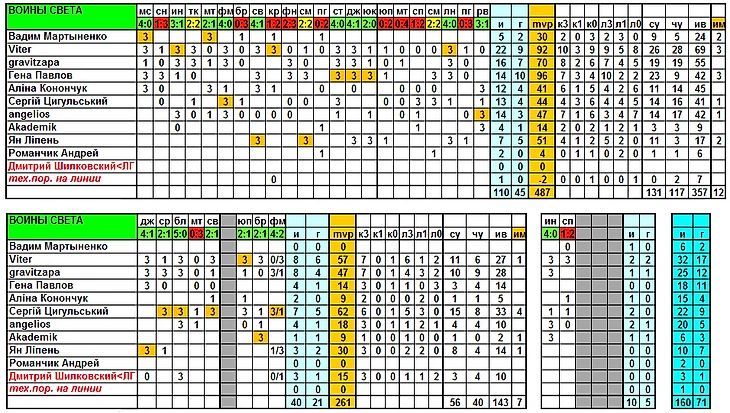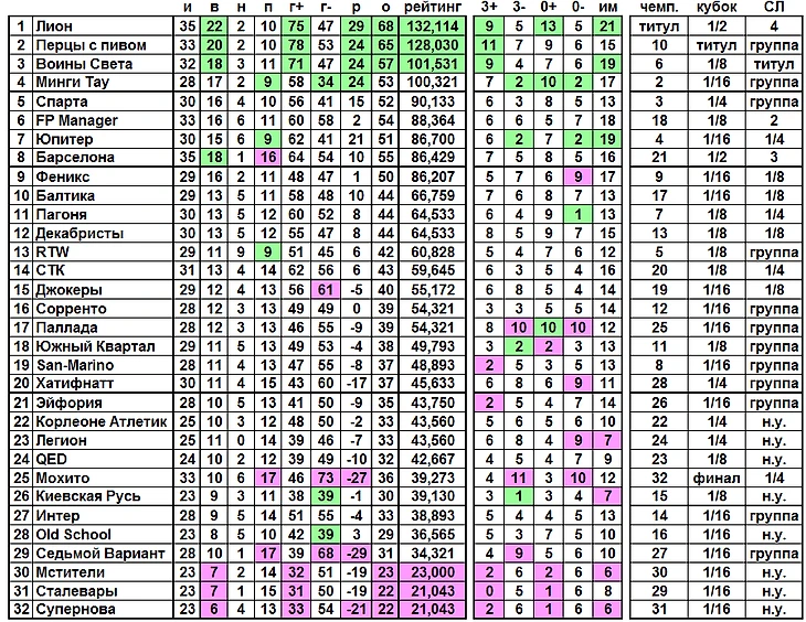 В завершение публикуем сводную таблицу за сезон. Команды расположены в ней согласно рейтингу. 3+ и 3- здесь крупные победы и поражения, 0+ и 0- сухие матчи с непропусканием и незабиванием голов, ИМ - игроки матча в чемпионате и Суперлиге. Зелёным цветом выделены лучшие показатели, розовым - худшие.