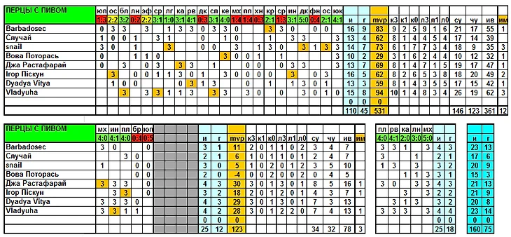 Но раз мы подводим итоги только регулярного сезона, то отдельно стоит упомянуть лишь о Кубке, где они разнесли всех соперников на корню. 5 побед подряд с общей разницей 18-1 – именно поэтому я часто вижу провозглашение Перцев с Пивом как лучшей команды в играх на вылет в 7-40. Очевидно, Дядя Витя может настроить свою команду на победу в конкретной игре. Но, к сожалению, умение так точечно собирать прогнозы для определённого МДП порой перечёркивается госпожой Фортуной. Но если Перцы смогут договориться с ней, то им наверняка не будет равных на этом ресурсе. К данному тезису располагает и мощнейшее сочетание высококлассных игроков (Barbadosec, Vladyuha и Джа Растафарай феерили по ходу всего сезона во всех турнирах), и оговоренное выше умение настроиться на конкретную игру. Посмотрим, сможет ли тренер команды настроить игроков на главный турнир ресурса (для меня это очевидно Торнео) и покорить и его. Я ставлю на то, что Перцы окажутся в топ-8 по результатам чемпионата, а вот более конкретный прогноз давать не стану.