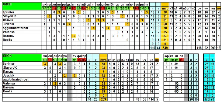 Так, SlayerUK сыграл в прошедшем сезоне побольше остальных, что и привело его к званию лучшего игрока команды в чемпионате по баллам mvp. В свою очередь, Виктория-Valensa, доселе бывшая главным тренером Лиона, почти не играла в первой части чемпионата, а малоизвестный мне игрок BooTs выходил стабильно, но стабильно редко. Тем не менее, количество выступлений за сезон распределено довольно ровно, что говорит о сложности выбора заявки (из-за очень качественных прогнозов) у тренера Лиона перед каждым туром. Надеюсь, что и в новом сезоне Sprinter и компания продолжат подтверждать свой высочайший уровень, попутно выиграв один трофейчик!