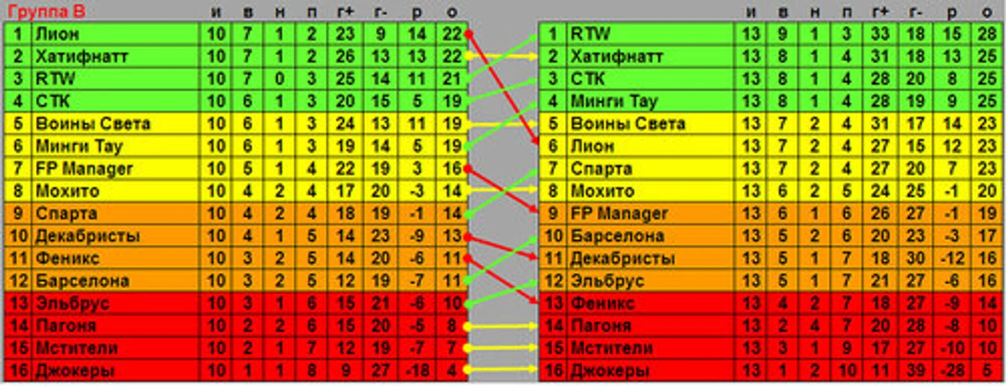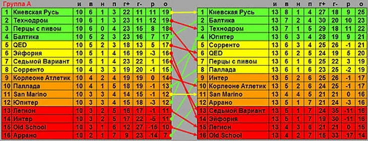 Для большей наглядности я привёл рядом таблицы после 10-ти и 13-ти туров, а стрелками указал перемещения команд. Какой цвет стрелки чему соответствует, вы и сами наверняка догадаетесь.