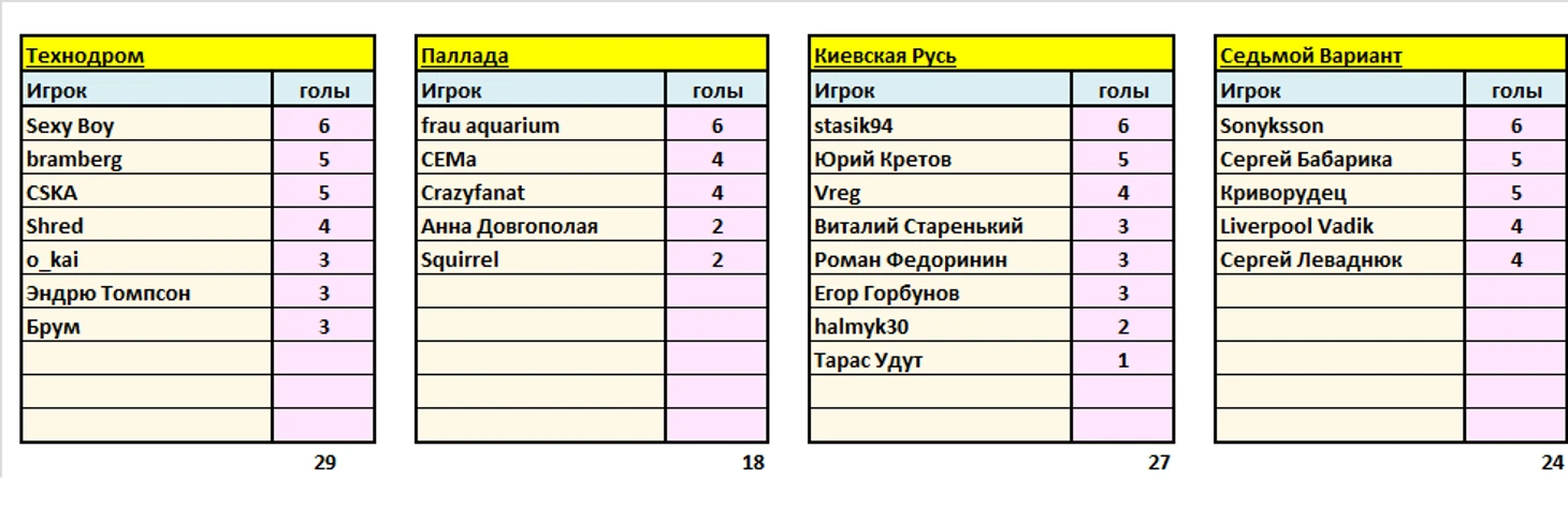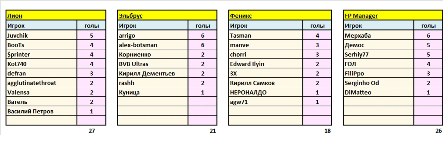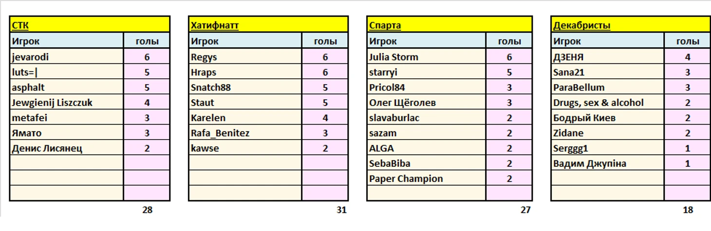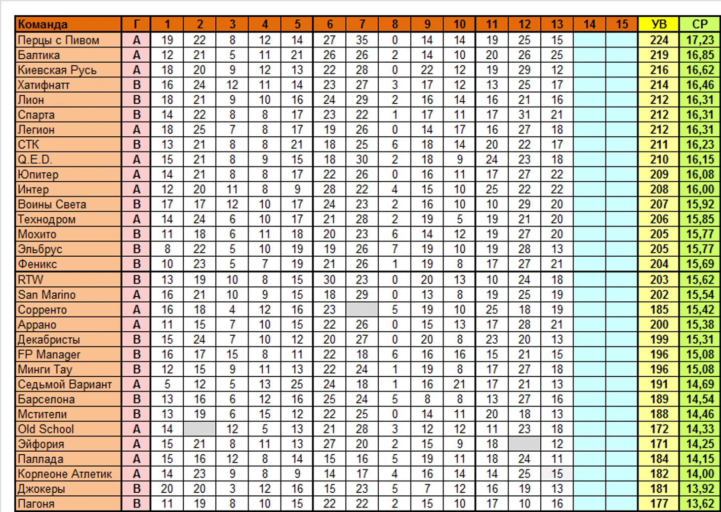 В преддверии финальной связки туров предварительного этапа чемпионата представляю вам таблицу всех команд по УВ, а также список бомбардиров по всем командам. Напомню, что технические голы, забитые при полной командной неявке соперника в личный зачёт не идут. Средний уровень у команд, допускавших пропуски, рассчитан по числу фактически проведённых туров.