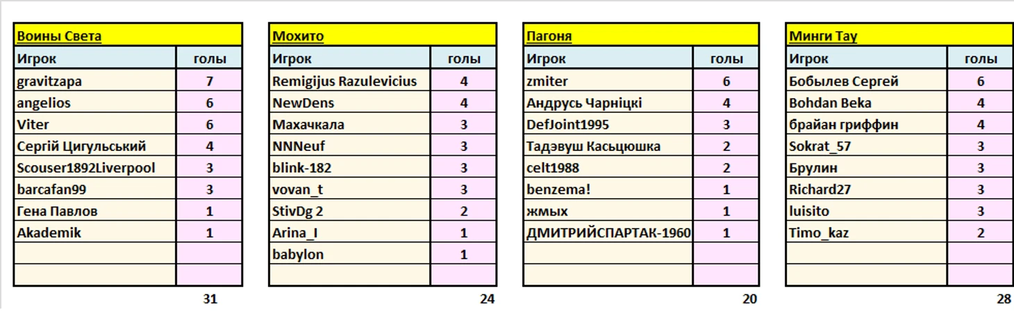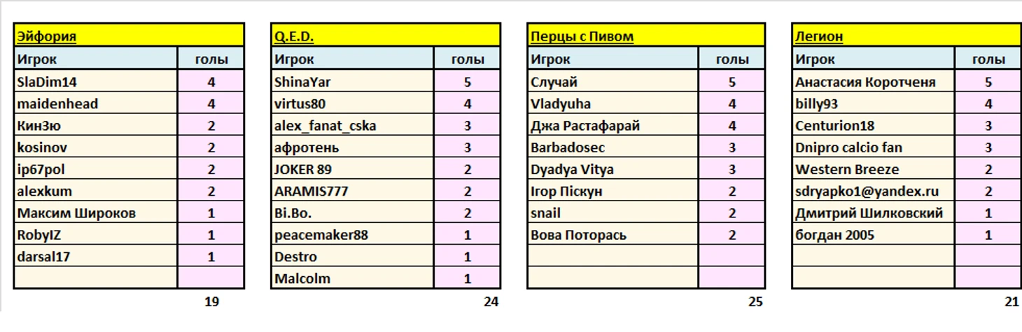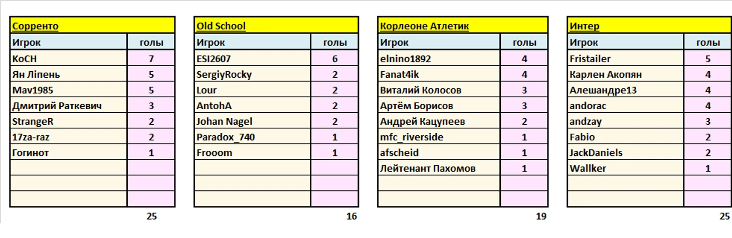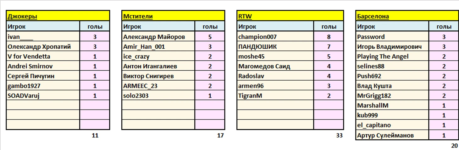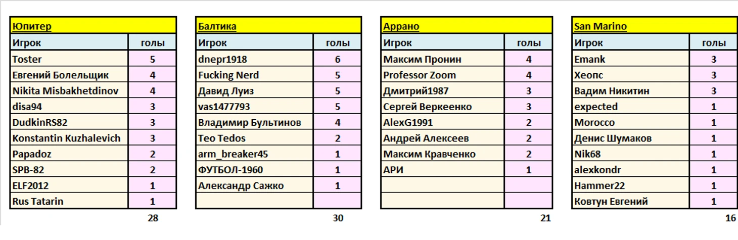 В преддверии финальной связки туров предварительного этапа чемпионата представляю вам таблицу всех команд по УВ, а также список бомбардиров по всем командам. Напомню, что технические голы, забитые при полной командной неявке соперника в личный зачёт не идут. Средний уровень у команд, допускавших пропуски, рассчитан по числу фактически проведённых туров.