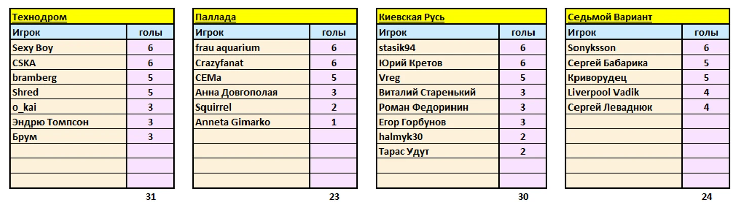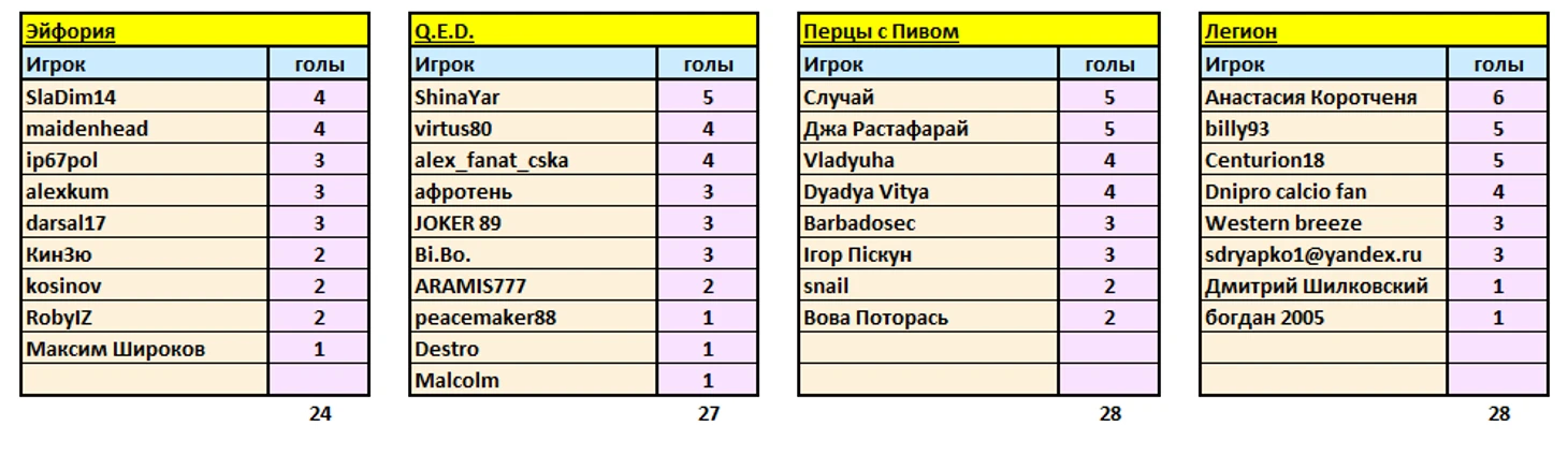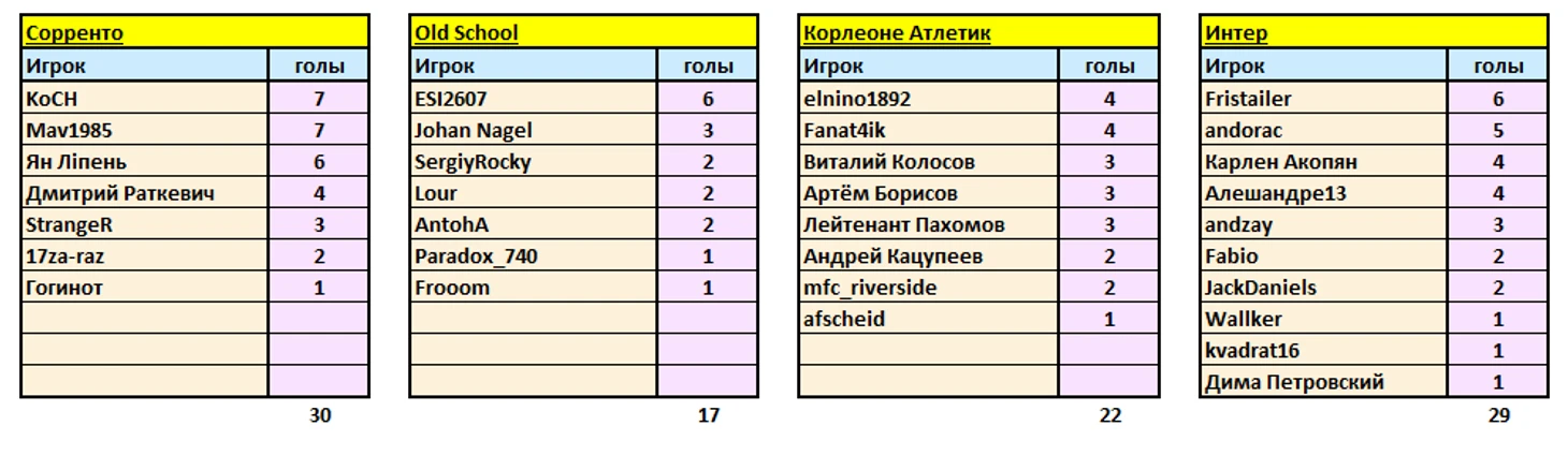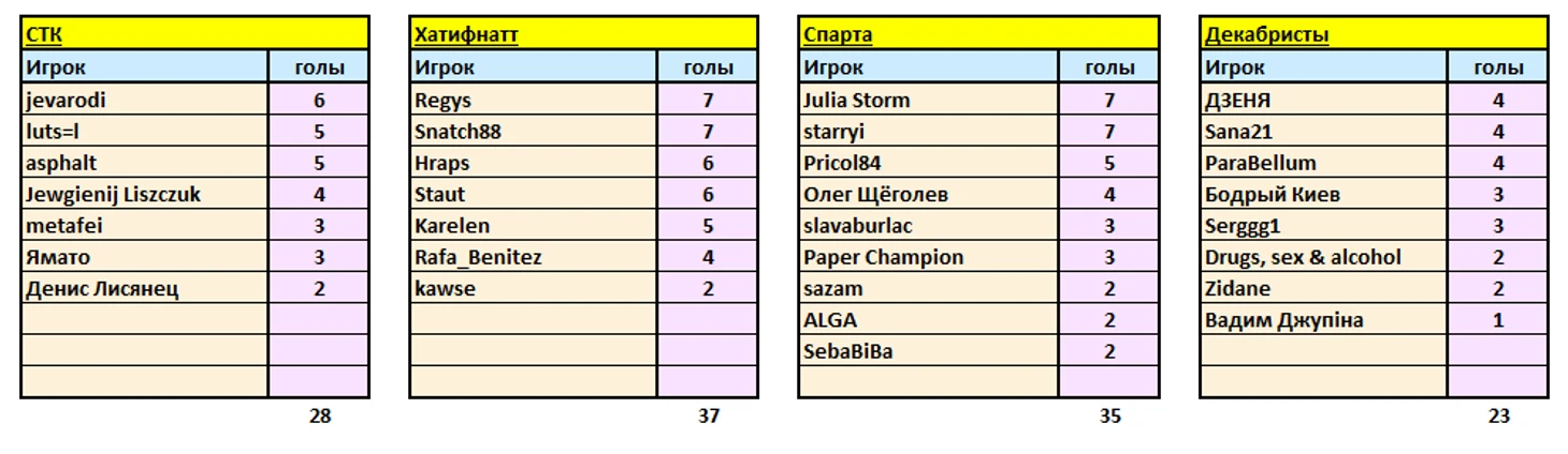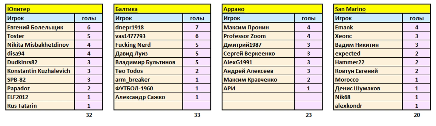 Прежде, чем представить пары на стартовый тур финального этапа, публикую бомбардирские списки по всем командам за весь первый этап, т.е. 15 туров.