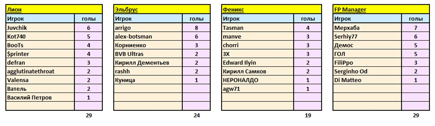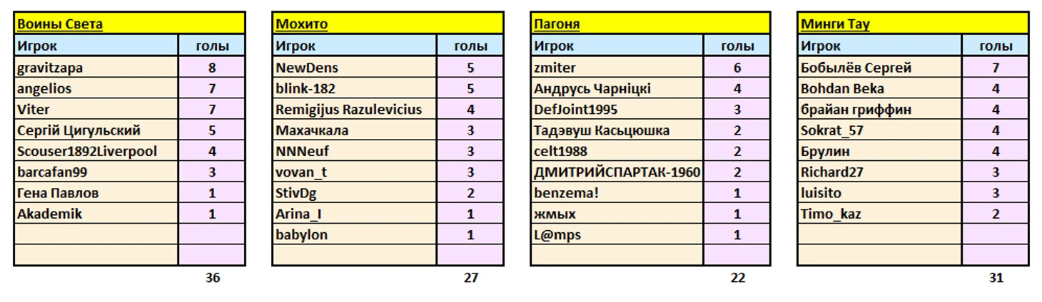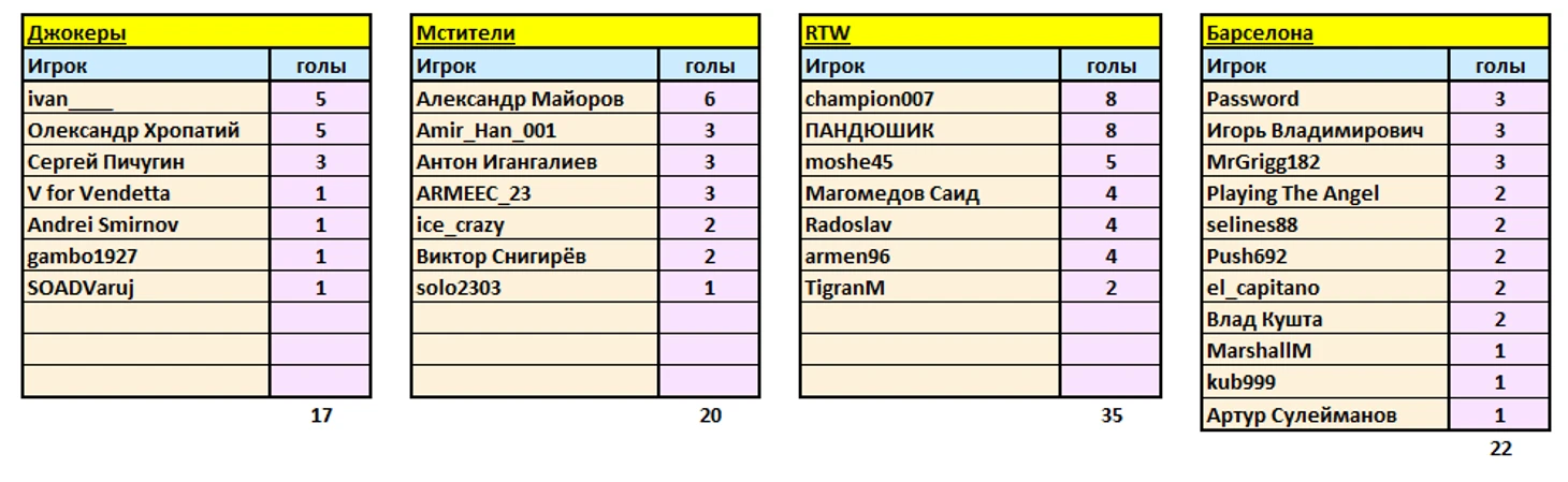 Единоличного лидера пока нет, 4 человека забили по 8 голов, это пара из RTW champion007 и ПАНДЮШИК, представитель Эльбруса arrigo и "воин света" gravitzapa. Борьба за звание лучшего снайпера продолжается, зачёт не обнуляется, будет пополняться по ходу всего 2-го этапа, первый тур которого пройдёт уже завтра.