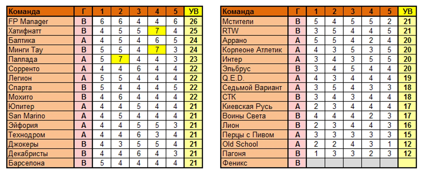 Лучшая команда тура по сумме УВ в целом: FP Manager (26 вариантов)