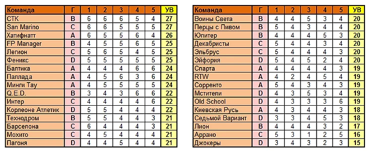 Лучшаие команды тура по сумме УВ в целом: СТК, San Marino (по 27 вариантов)