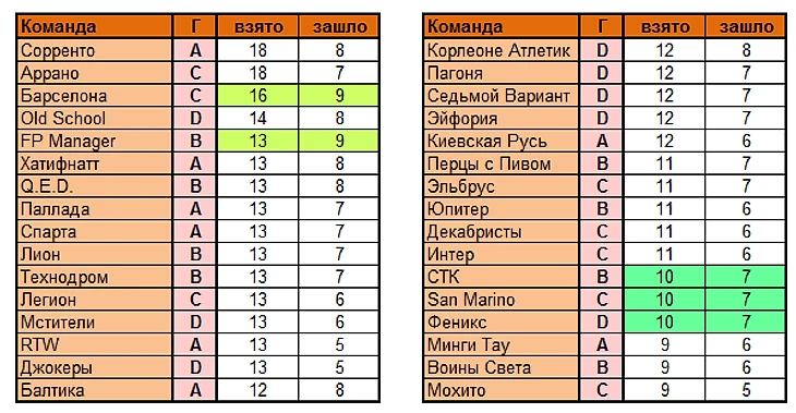 Команды, использовавшие наименьшее число вариантов: Минги Тау, Воины Света, Мохито (по 9 вариантов)