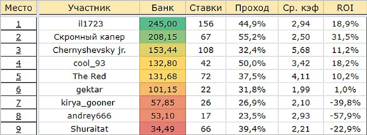 Самый лучший день выдался у Скромного капера: «Юве» и «Монако» прошли дальше, принеся в казну солидный плюс. А вот у других активных ставочников будни не задались: Chernyshevsky jr. подвели немецкие тоталы, оставив того на третьем месте.
