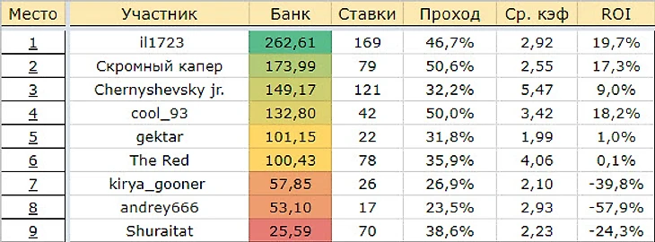 Поздравляем il1723 с уверенным первом местом в турнире — он опередил своих соперников как по итоговому банку, так и по ROI.