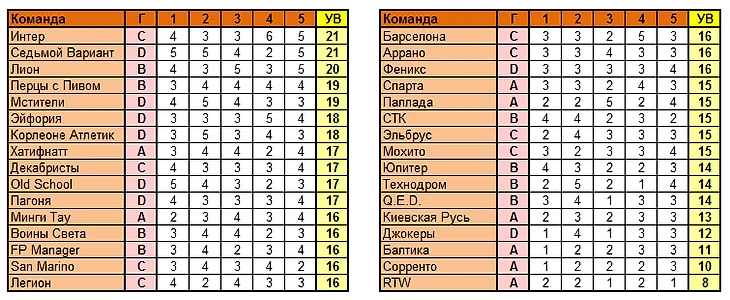 Лучшие команды тура по сумме УВ в целом: Интер, Седьмой Вариант (по 21 варианту)