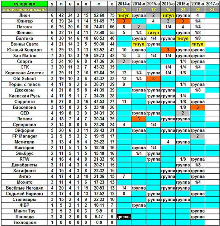Ну и хватит слов. Дальше только таблицы - турнирные по каждому розыгрышу и сводная за всю историю Суперлиги. (Везде для удобства восприятия указаны нынешние названия команд. В сводной не учтены результаты стартовавшего нынче 7-го розыгрыша.)