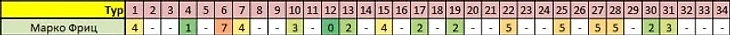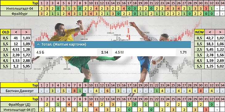 Отмечу, что по стратегии, не различающей матчи дома и на выезде, value в этом матче не наблюдается, поэтому играть ставку на ТЖК<4,5 за 1,816 будем только по новой схеме. Ситуация вызвана в первую очередь тем, что в гостях Айнтрахт получает меньше жёлтых карточек, чем дома. Коэффициент Марко Фрица перед этой встречей составляет 1,45. 2500 рублей - таков размер ставки на этот матч.