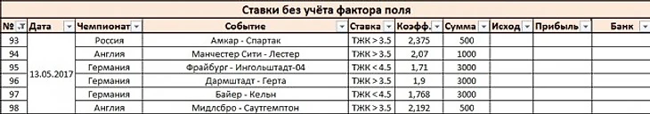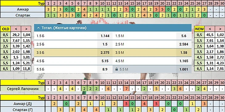С жёлтыми карточками ситуация соответствующая: value при ставке на ТЖК>3,5 за 2,375 конечно есть, но совсем хилый. Коэффициент Сергея Лапочкина 1,86. Ориентируясь на рассудок и эмоции - этот матч я бы конечно обошёл стороной) Но по стратегии ставка всё равно будет сделана: 500 рублей без учёта фактора поля. 1000 рублей по стратегии, учитывающей фактор поля.