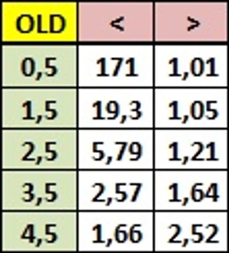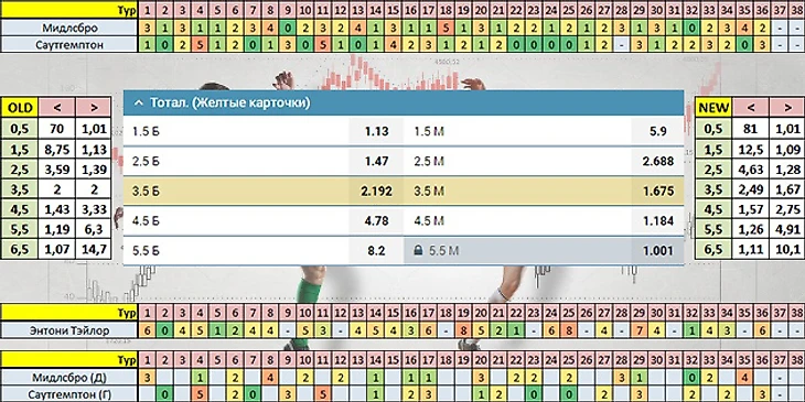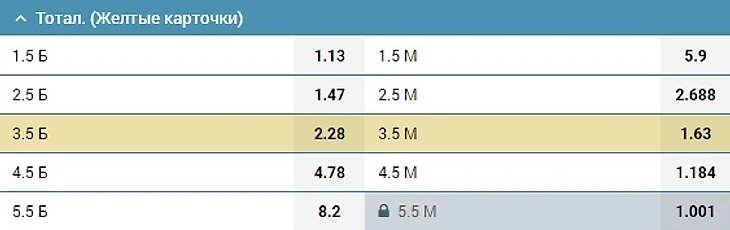 Ну а я, несмотря на кажущуюся нелогичность этого, продолжу играть "верха" по карточкам в матчах такого рода. Коэффициенты Энтони Тэйлора таковы: 1,27 на ТЖК>2,5 и 1,47 на ТЖК>3,5. Второй вариант (ТЖК>3,5 за 2,192) забираем по обеим стратегиям: 500 рублей по старой, 2500 по новой. Первый вариант (ТЖК>2,5 за 1,47) я не буду брать по старой схеме из-за совсем уж небольшой разницы между расчётным коэффициентом и коэффициентом букмекера. Но по стратегии с учётом фактора поля 3500 рублей поставлю.