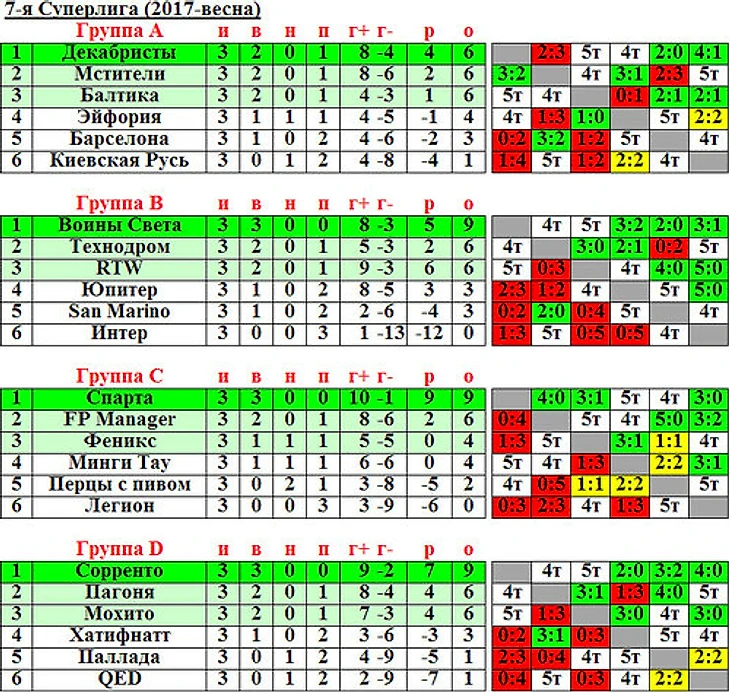 Наконец, группа А, в которой ясно только то, что абсолютно ничего не ясно. Вроде бы чуточку получше шансы у Мстителей (благодаря личным победам над двумя близкими конкурентами), а у Киевской Руси они совсем махонькие, однако исход практически любого матча может перевернуть всё с ног на голову. Очень непростой календарь у Балтики, тогда как результативность «пивоваров» оставляет желать лучшего, но и у лидирующих пока Декабристов он не лучше. Так что я не удивлюсь любому составу итоговой первой тройки в этой группе.