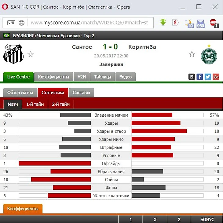 Команды провели разные матчи в первом туре. Сантос проиграл Флуминенсе в жесткой борьбе 3-2 на выезде, а Коритиба выиграла дома Атлетико Гойаниенсе 4-1. Конечно Сантос дома не так часто теряет очки, но тут стоит сыграть на гостей. Во многом из-за того что ночью 18 числа Сантос играл в Боливии в рамках Кубка Либертадорес и с большим трудом смог выстоять 1-1, но это им не гарантировало 1 место в группе, а всего лишь путевку в плей-офф. Теперь ночью 24 мая Сантос будет играть с худшей командой группы за право выйти в плей-офф с первого места. В таких ситуациях обычно тренеры в Южной Америке делают ротацию и выскают дубль и потому шансы Коритибы добыть в этой встрече какие либо очки значительно возрастают.
